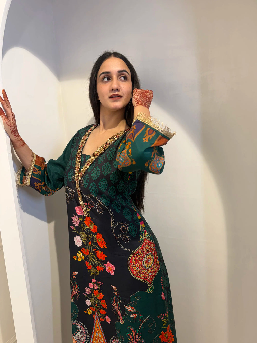 Design: Intricate multi-color floral and paisley digital print on a dark emerald canvas.