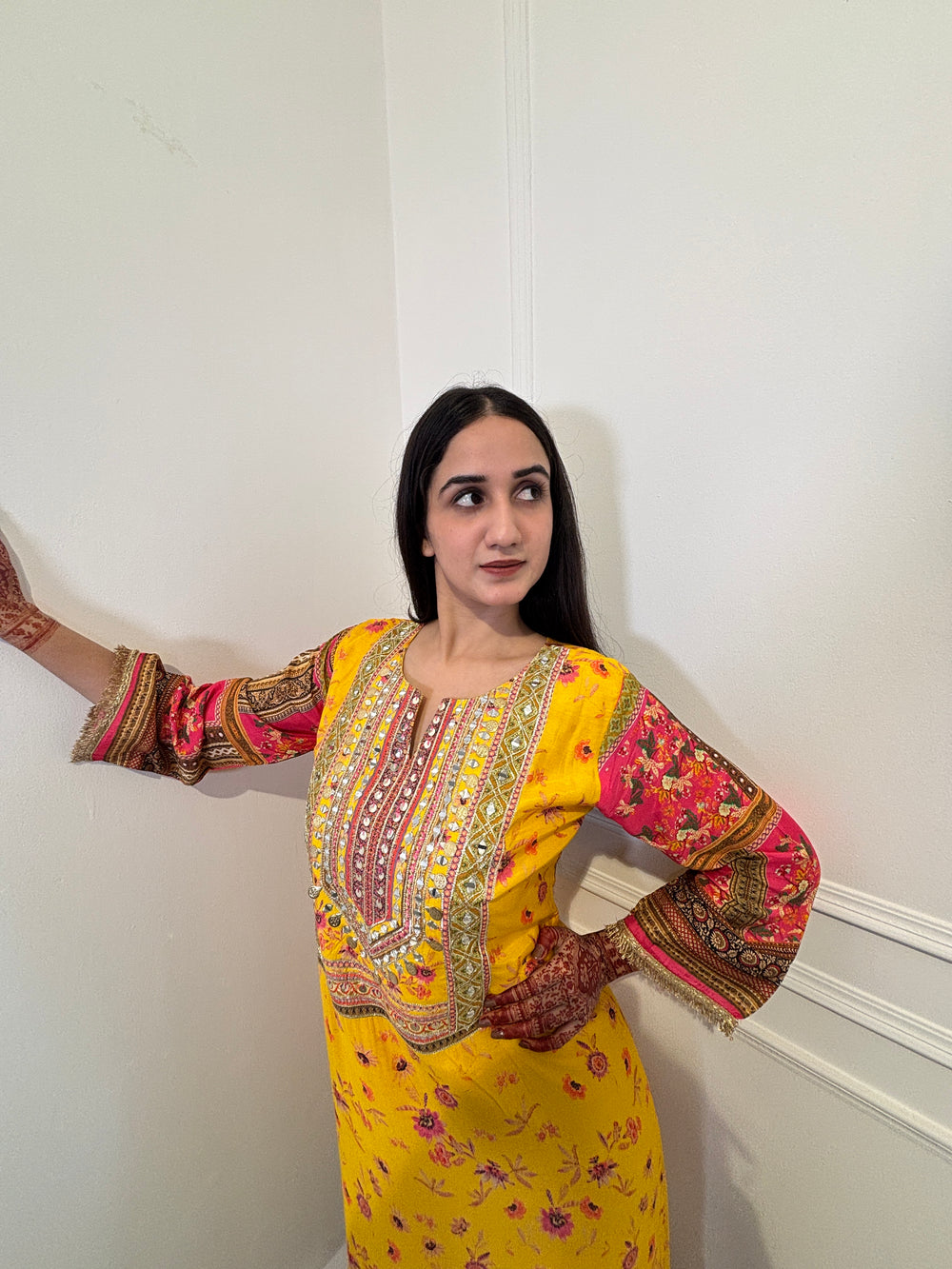 xEmbrace timeless grace with our Marigold Muse Choga. Crafted in a vibrant mustard yellow, this piece features intricate mirror-work (Sheesha) embroidery along the bodice and festive pink-toned sleeves. The silhouette is designed for effortless movement, finished with a traditional patterned border that adds weight and elegance to the drape. Perfect for Mehendi ceremonies or festive gatherings.